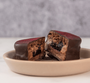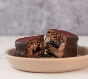 Masa tierna de cacao, relleno de dulce de leche repostero mas un corazon de reduccion de Malbec, bañado de chocolate negro.